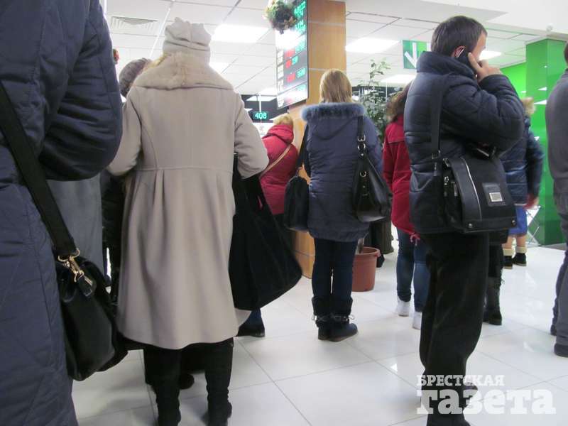 Единственным банком, где на вопрос «Есть ли валюта?» ответили положительно, был один из банков на бульваре Космонавтов. То, что там ситуация отличается от увиденного нами в других пунктах, заметно еще с улицы, куда вылез «хвост» очереди. Благо сегодня в Бресте тепло, хотя и немного сыро. Несравнимо больше людей внутри — не протолкнуться. Консультант объяснила, что валюта банком продается, но никто не гарантирует, что ее хватит на всех.