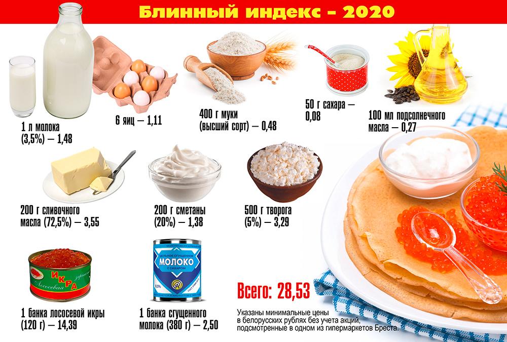 По подсчетам «БГ», блинное меню в 2020 году обойдется в 28,53 рубля. В прошлом году Масленица облегчала кошелек жителя Брестчины на 31,64 рубля. Несмотря на снижение блинного индекса, цены на большинство «масленичных» продуктов, таких, как сливочное масло, молоко, сметана, творог, выросли. А вот с лососевой икрой повезло: 120-граммовую баночку в этом году мы нашли за 14,39 рубля. В прошлом самая недорогая стоила 18,45.