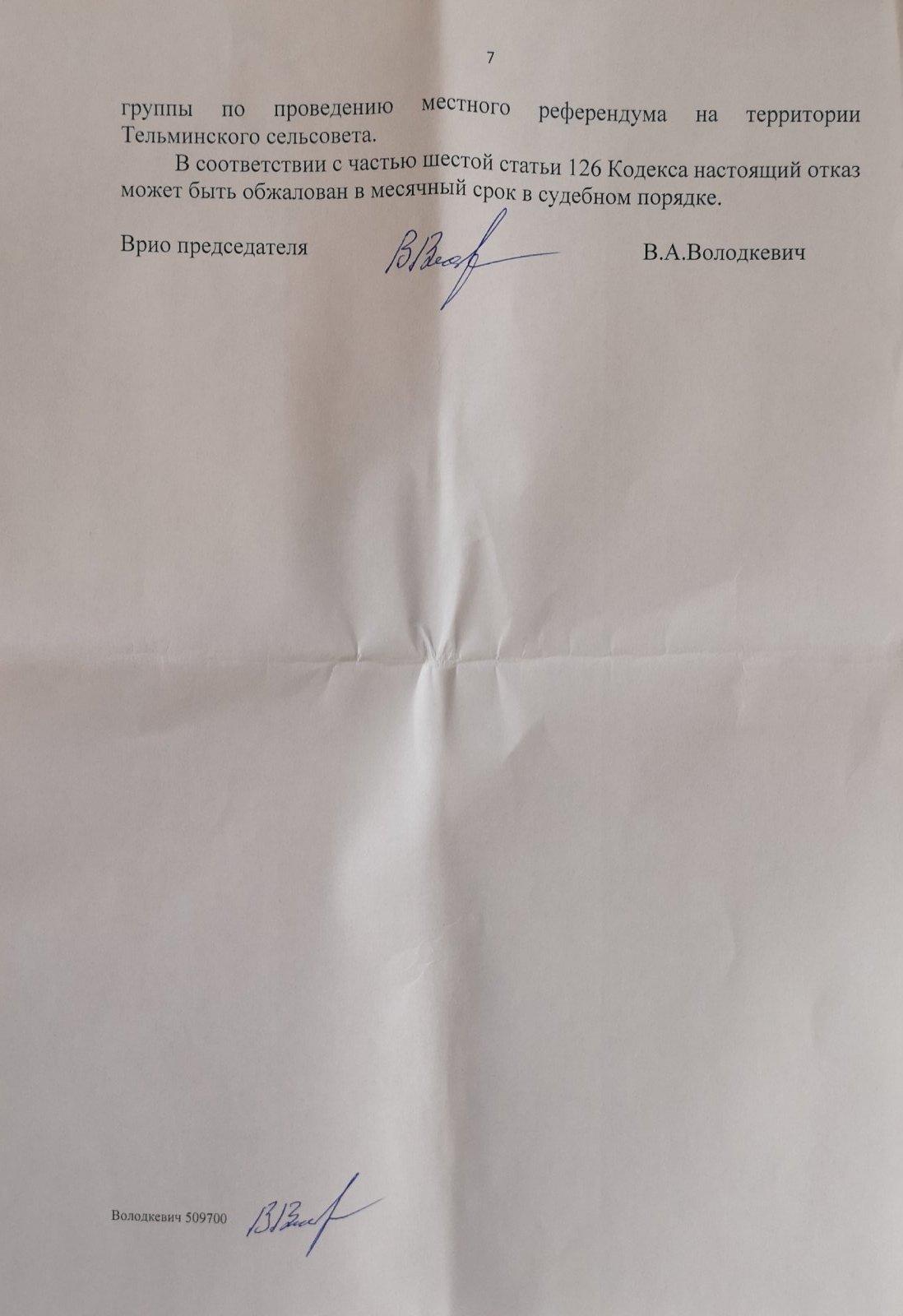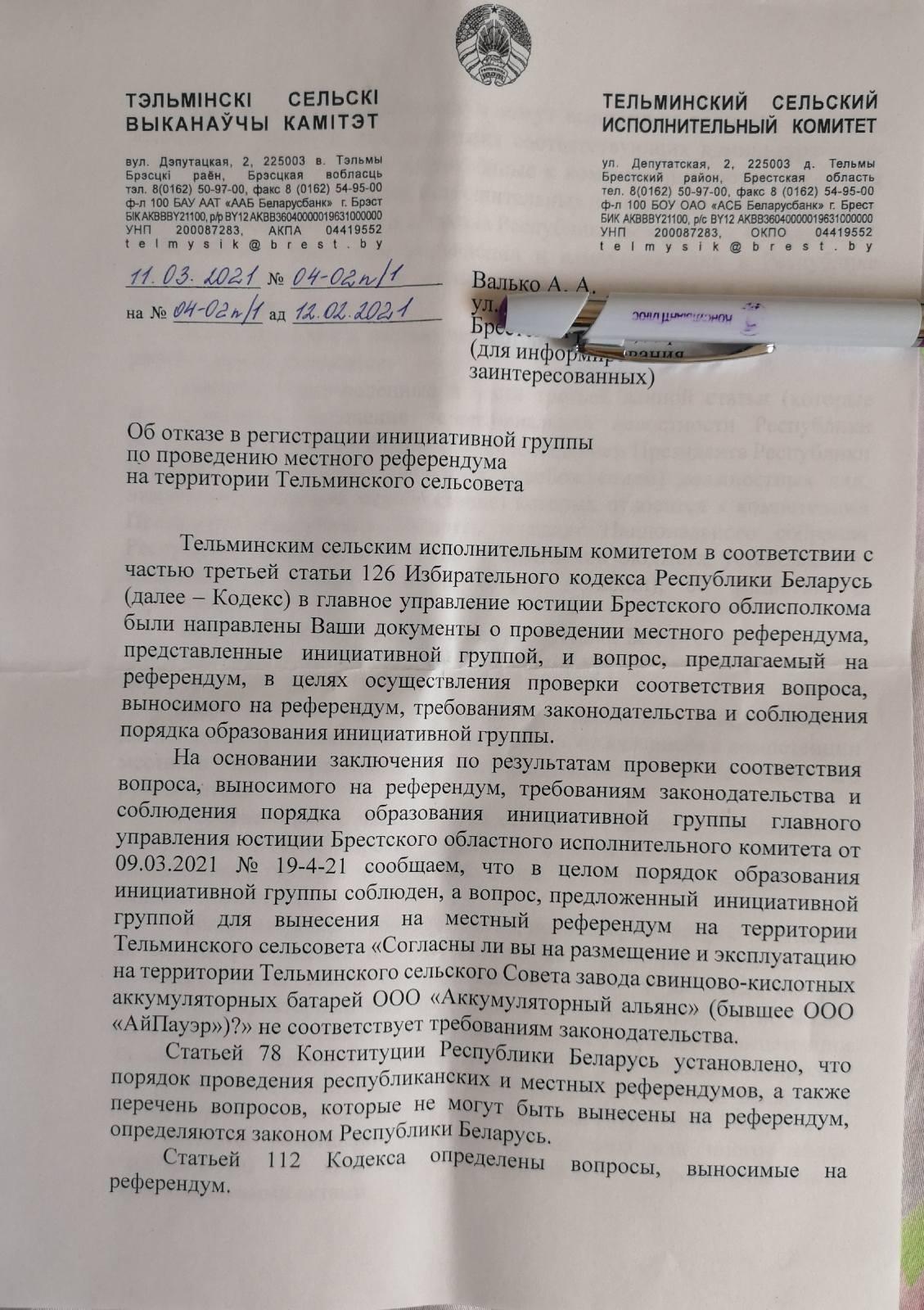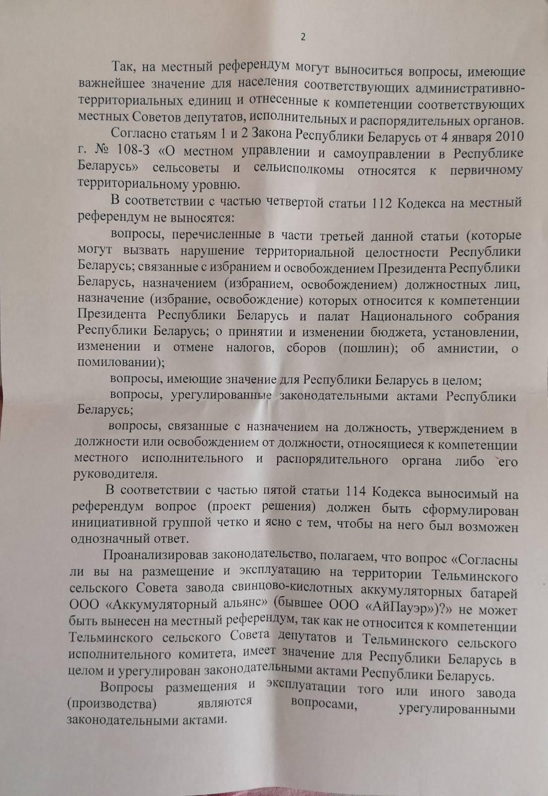 В отказе, который занимает семь листов, говорится, что в целом порядок образования инициативной группы соблюден, однако вопрос, выносимый на референдум, не соответствует требованиям законодательства – в компетенцию сельисполкома не входит вопрос размещения и эксплуатации предприятия, имеющего значение для всей страны. К слову, именно с такой формулировкой в регистрации инициативной группы по проведению местного референдума еще в январе 2019 года активистам отказал Брестский райисполком.