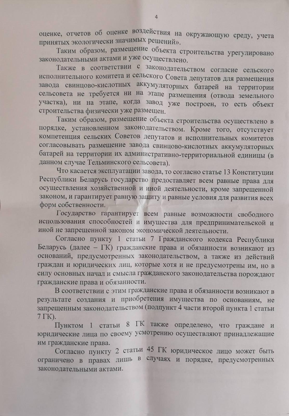 «Власти в очередной раз для необоснованного ограничения права граждан на участие в решении государственных и общественных вопросов ссылаются на компетенцию местных органов управления. Именно жители близлежащих от аккумуляторного завода деревень прежде всего пострадают от его вредного воздействия. Поэтому убежден, что прежде всего люди, живущие на территории Тельминского сельсовета, имеют как юридическое, так и моральное право решать судьбу данного вредного предприятия», — прокомментировал решение сельисполкома правозащитник Роман Кисляк.