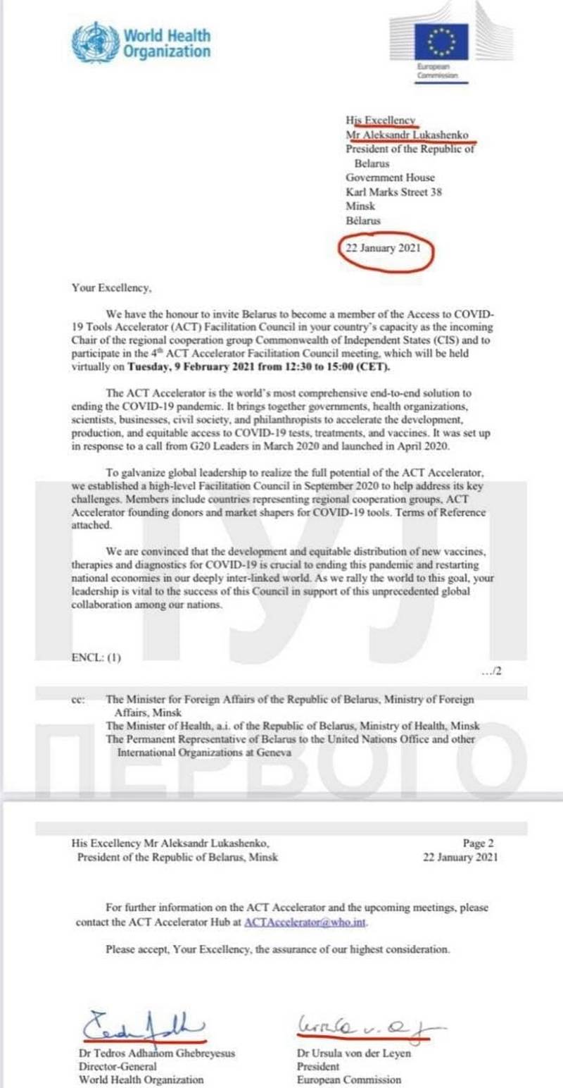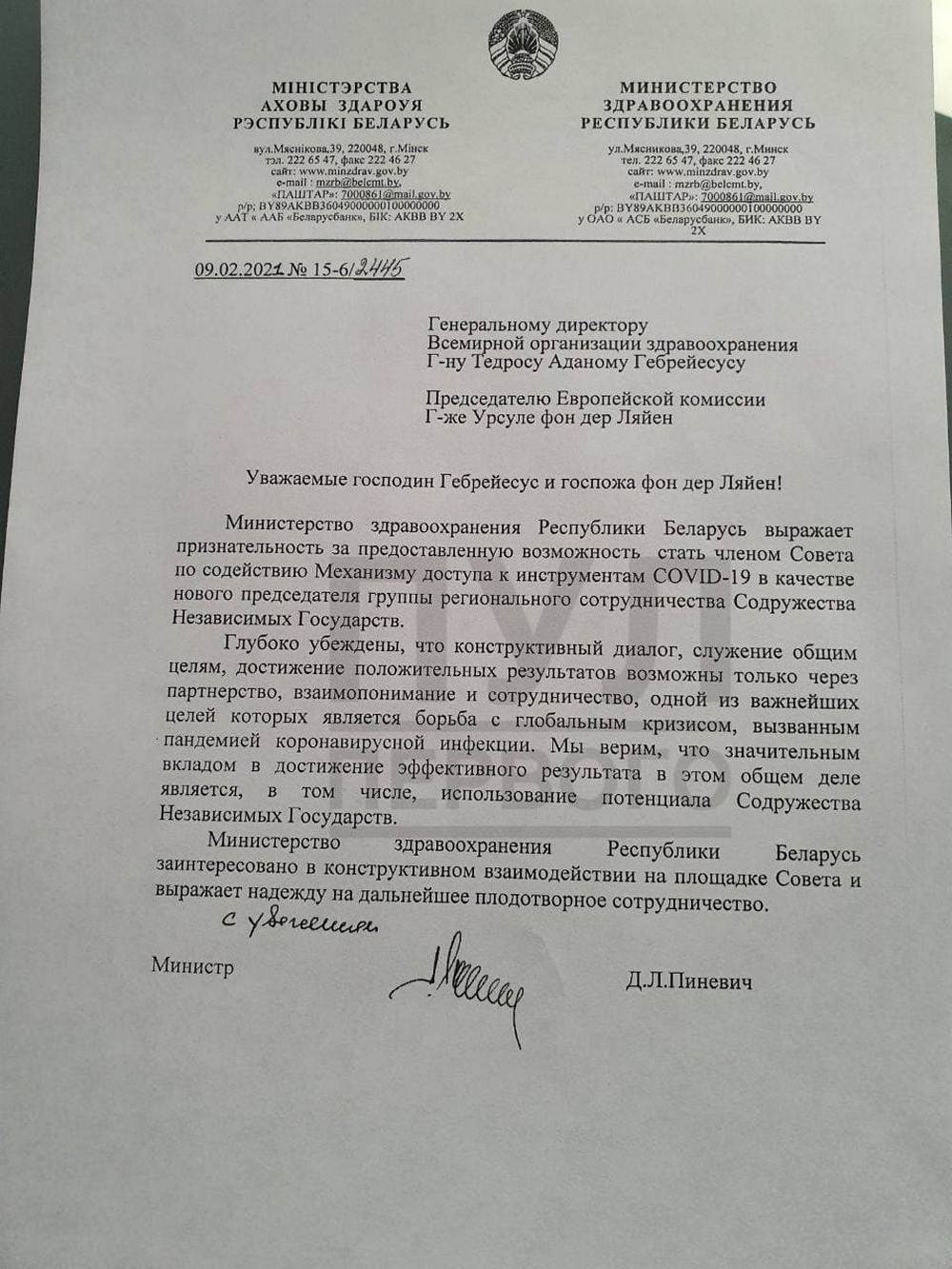Чуть позже «Пул первого» продемонстрировал фото письма белорусского Минздрава, адресованного генеральному директору Всемирной организации здравоохранения Тедросу Аданому Гебрейесусу и председателю Европейской комиссии Урсуле фон дер Ляйен, подписанное министром Г.Л.Пиневичем.