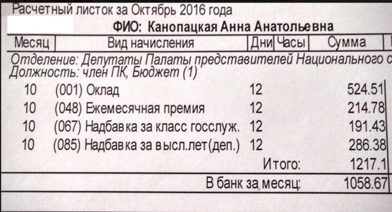 А ниже — расчетный листок, который Анна Канопацкая опубликовала на своей странице в соцсети в начале своей работы в парламенте. Согласно ему, за 12 рабочих дней в октябре 2016 года ее депутатская зарплата составила 1 058 рублей 67 копеек.