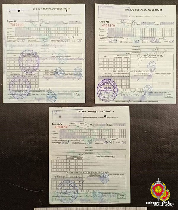 «Согласно выводам судебного эксперта в первоначальное содержание записей в некоторых графах трех предоставленных листков нетрудоспособности вносились изменения способом подчистки первоначальных записей и дописки (дорисовки) на их месте ныне читаемых. Судебные эксперты смогли восстановить первоначальное содержание листков нетрудоспособности, брестчанка «продлила» каждый больничный лист на неделю», — рассказала официальный представитель управления ГКСЭ по Брестской области Анна Мацкевич.