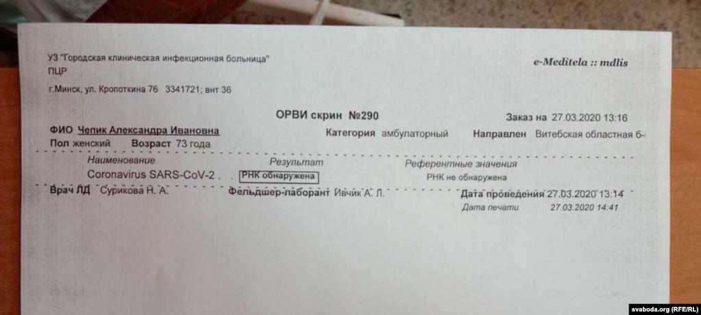 Как рассказала дочь покойной Наталья Чепик, примерно в середине марта она сама заболела. У нее был сильный кашель и высокая температура. Женщина лежала в витебском тубдиспансере. Однако ей не ставили диагноз «пневмония». По ее просьбе ей сделали тест на коронавирус, но тот дал отрицательный результат.
