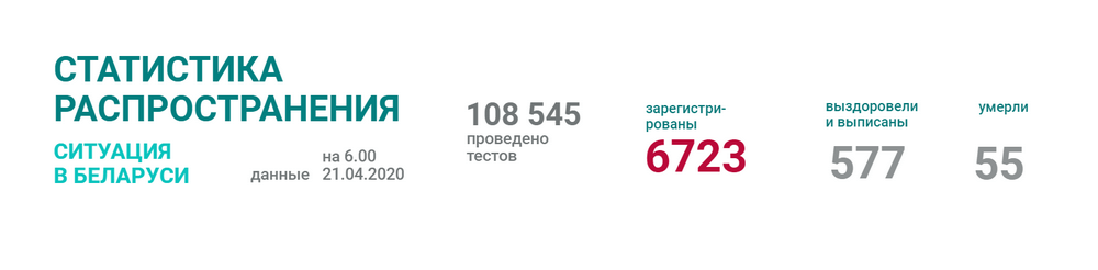 По данным на 21 апреля, в Беларуси зарегистрировано 6 723 человека с положительным тестом на COVID-19, сообщил вечером во вторник Минздрав. Свежие цифры по областям на этот раз ведомство не озвучило, в пресс-релизе лишь говорится, что «в регионах статистика по выявленным случаям существенно не поменялась».