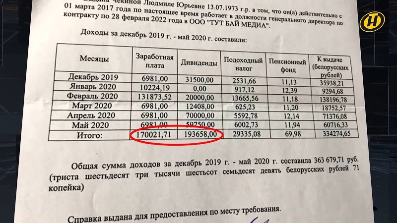 Далее говорится, что это – за весь льготный период, с осени 2019 года по май 2021-го. Эти льготы распространялись на сотрудников компании и руководство. После этого демонстрируется якобы справка о доходах гендиректора TUT.BY Людмилы Чекиной, согласно которой за период с декабря 2019-го по май 2020-го она заработала более 363 тысяч рублей. В сюжете делается акцент на то, что в пенсионный фонд из этих денег уплачено только 69 рублей, а «что показательно, сэкономленные на пенсионерах деньги должны были уютно устроиться в одном из латвийских банков».