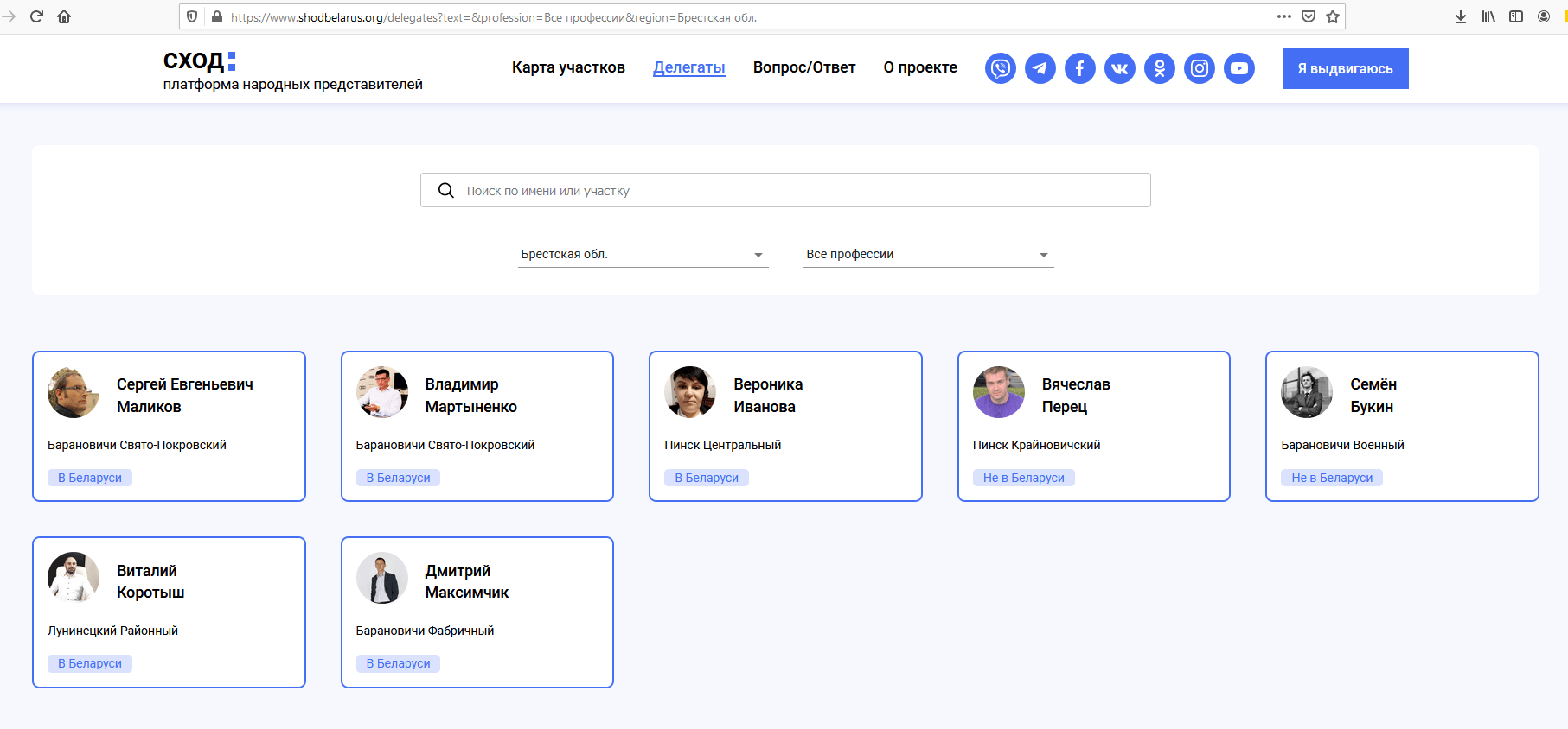 От области первый этап успешно прошли семь человек, в том числе четверо из них — представители Барановичей. От этого райцентра зарегистрированы руководитель частного предприятия Сергей Маликов, ИП Владимир Мартыненко, ИП Дмитрий Максимчик и бывший член национальной сборной по спортивной гимнастике Семен Букин (уехал из страны). От Пинска на «Сход» идут директор фирмы Вероника Иванова и бывший врач-гигиенист Пинского зонального ЦГЭ Вячеслав Перец (уехал из Беларуси). Лунинецкий район на «Сходе» пока что хочет представлять начальник отдела исследований в исследовательской компании Виталий Коротыш.