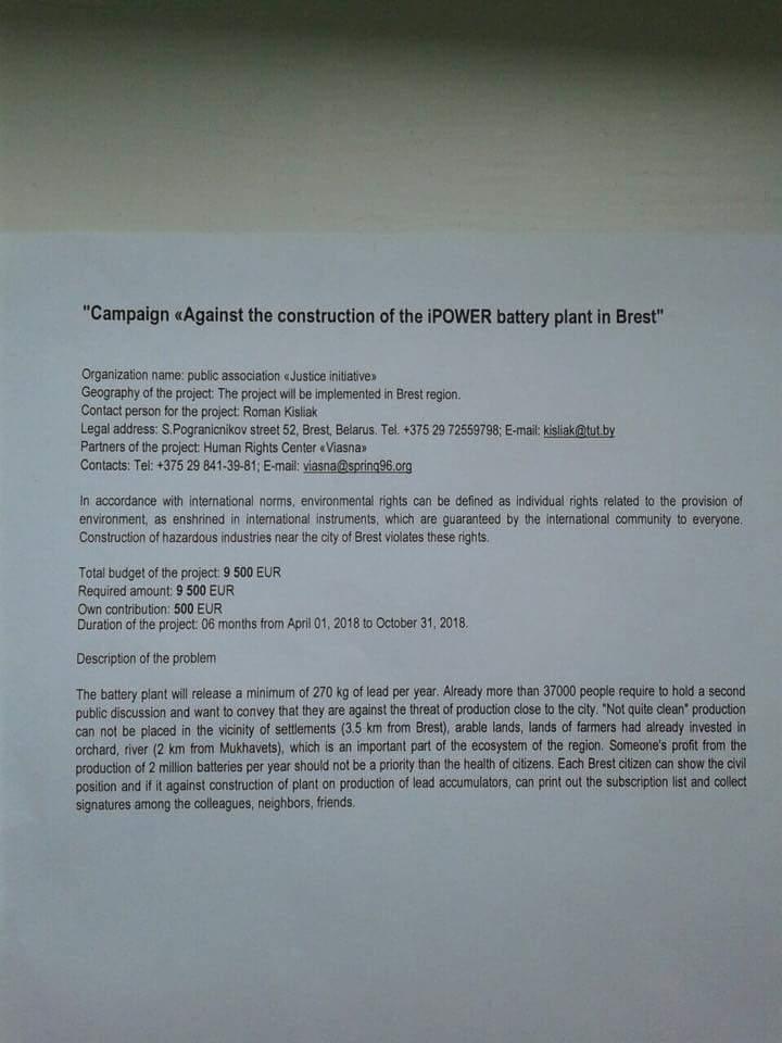 Как ранее писала «БГ», с начала года в Бресте и районе развернулась активная кампания против строительства рядом с областным центром аккумуляторного завода «АйПауэр». Самые активные противники завода вошли в инициативную группу, которая заявляет о многочисленных нарушениях на различных этапах реализации проекта по строительству завода АКБ. Менее чем за два месяца было собрано почти 38 тысяч подписей жителей Бреста и района, которые были переданы вместе с обращением в Администрацию президента. Правительственная комиссия, созданная после этого обращения, нарушений не нашла.