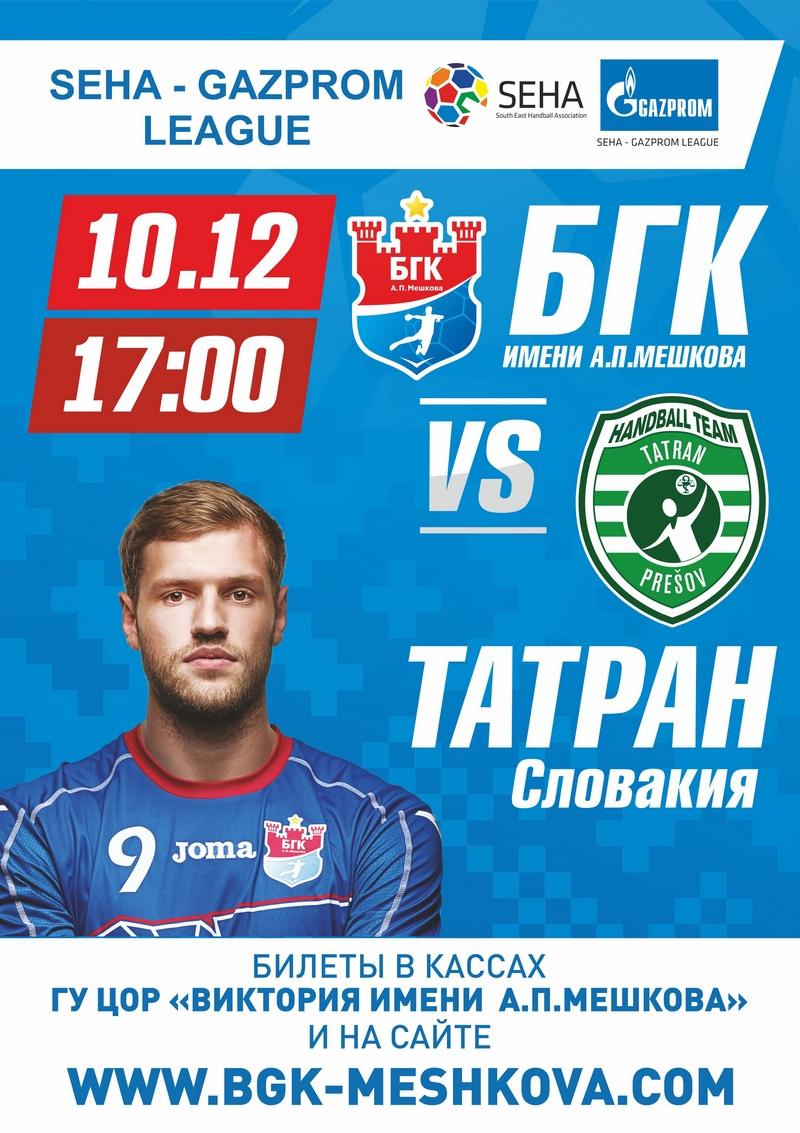 Важный матч в SEHA-лиге. После победы над «Загребом» БГК им. Мешкова закрепился на втором месте в турнирной таблице. Теперь на очереди словацкий «Татран». Напомним, в первом туре в драматичной концовке встречи наша команда уступила один мяч — 23:24. Пришло время взять реванш. Известно, что при родных трибунах мешковцы выступают значительно лучше. Так поддержим наших ребят! Время — 10 декабря в 17.00, Дворец спорта «Виктория»! Ждем!