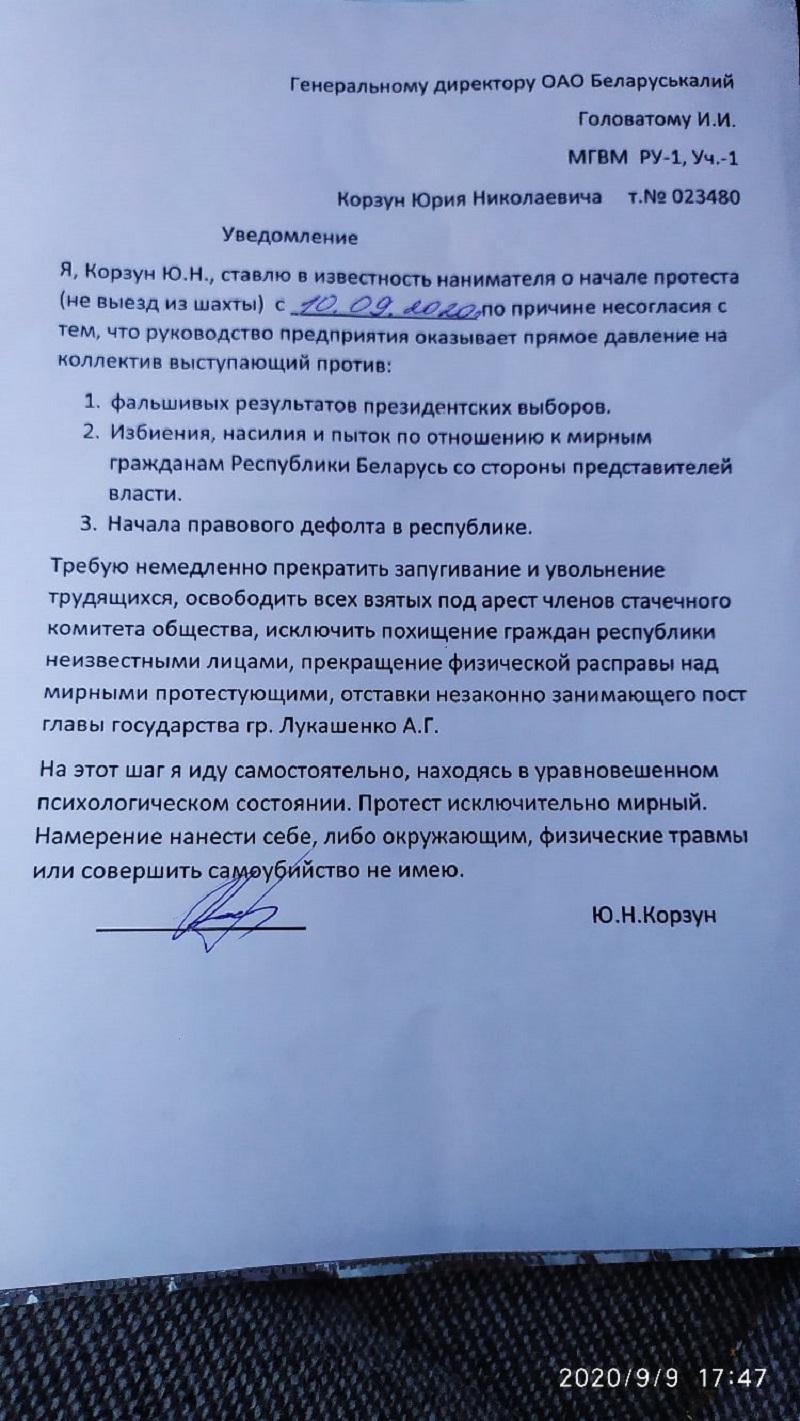 «Требую немедленно прекратить запугивание и увольнение трудящихся, освободить всех взятых под арест членов стачечного комитета общества, исключить похищение граждан республики неизвестными лицами, прекращение физической расправы над мирными протестующими, отставки незаконно занимающего пост главы государства Александра Лукашенко», — озвучил Юрий Корзун свои требования в письме к генеральному директору «Беларуськалия».