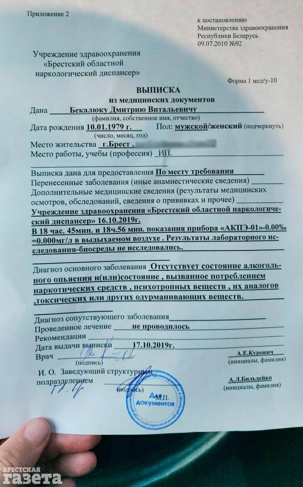«Вчера я ехал по улице Радужной на аккумуляторный завод за документами. Не доезжая до путепровода на Березовке в 18.15 меня остановила машина ГАИ, которая ехала за мной с включенными проблесковыми маячками. Сотрудники сказали, что на меня получена ориентировка, мол, я нетрезвый еду за рулем, и мне нужно пройти освидетельствование. Мы поехали на освидетельствование, и вышел я в 20.30. Естественно, никакого алкоголя не нашли», — рассказал «БГ» Дмитрий Бекалюк 17 октября.