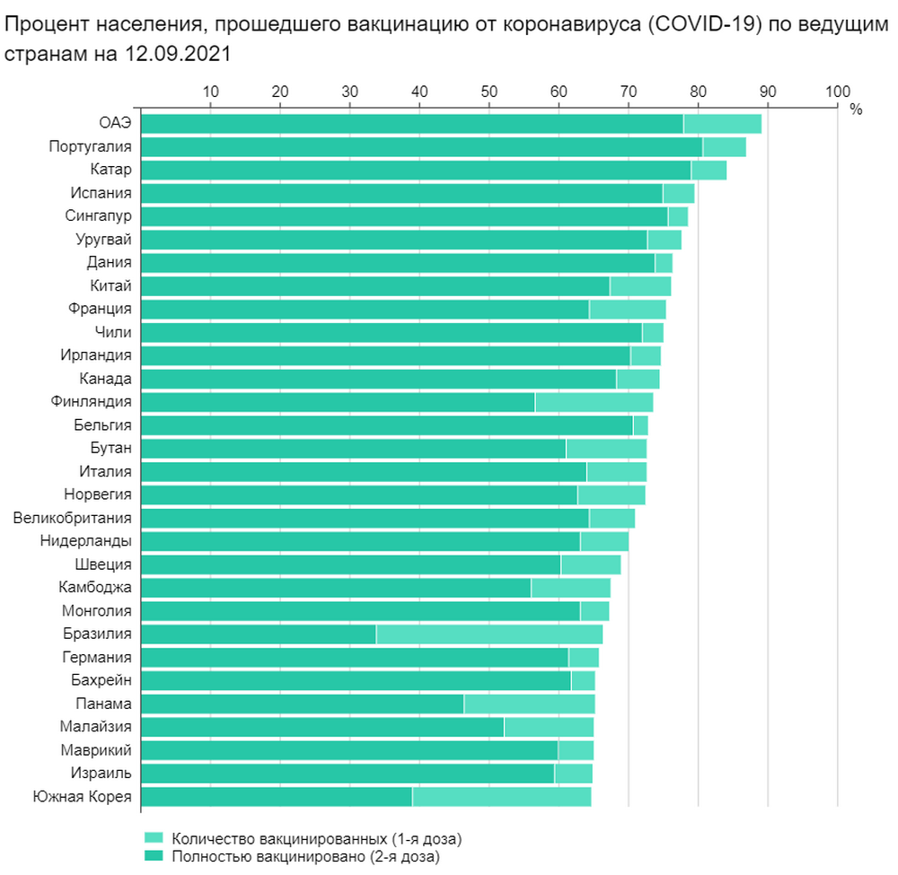 Примерно в то же время стартовал процесс вакцинации и в Европе. Но по итогу, к середине сентября, ситуация отличается разительно. Лучше ситуация выглядит и в России. Там по данным того же index.minfin.com.ua вакцинировано 31,23% населения, а полностью вакцинировано – 27,18%.