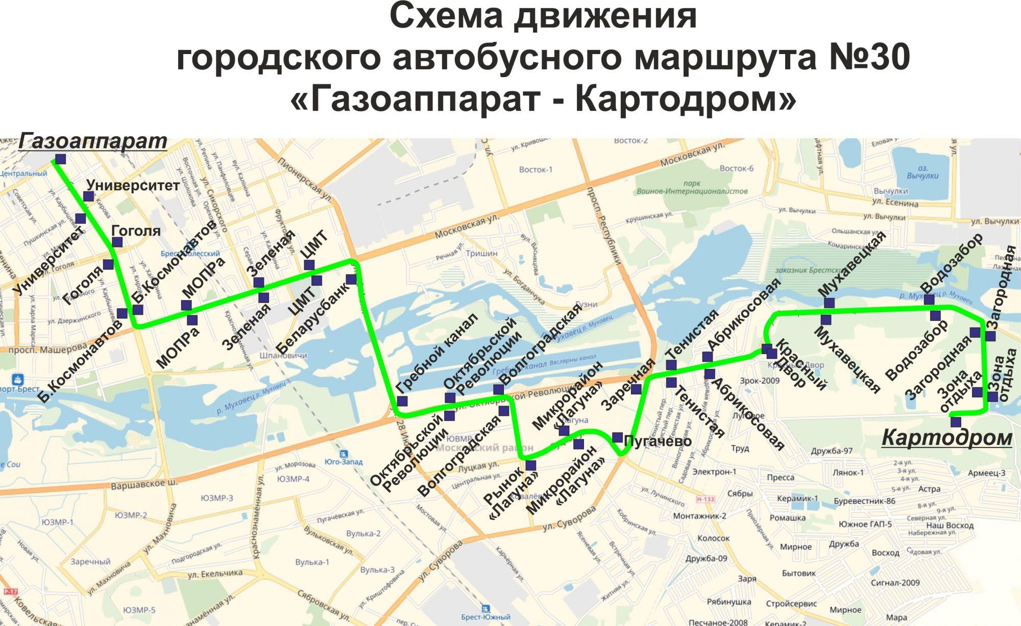 С 1 марта изменяется маршрут следования автобуса №30 с прохождением по ул. Октябрьской Революции – Волгоградская – Луцкая – Проспект Республики и далее по существующему маршруту в прямом и обратном направлениях.