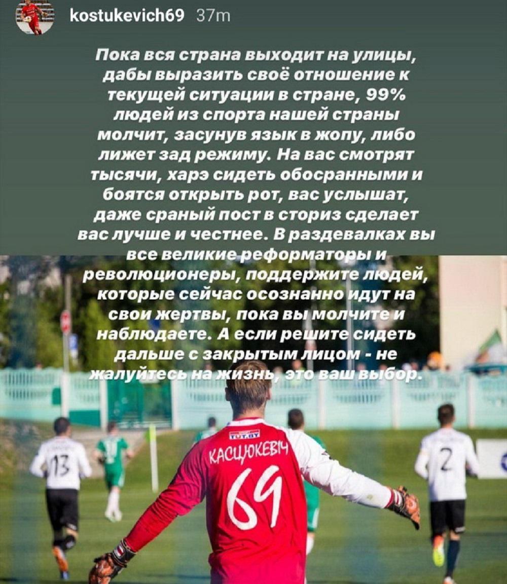 «Пока вся страна выходит на улицы, дабы выразить свое отношение к текущей ситуации в стране, 99% людей из спорта нашей страны молчит, засунув язык в жопу, либо лижет зад режиму. На вас смотрят тысячи, харэ сидеть обосранными и боятся открыть рот, вас услышат, даже сраный пост в сториз сделает вас лучше и честнее. В раздевалках вы все великие реформаторы и революционеры, поддержите людей, которые сейчас осознанно идут на свои жертвы, пока вы молчите и наблюдаете. А если решите сидеть дальше с закрытым лицом не жалуйтесь на жизнь, это ваш выбор», — написал Евгений Костюкевич в Instagram (орфография и пунктуация сохранена).