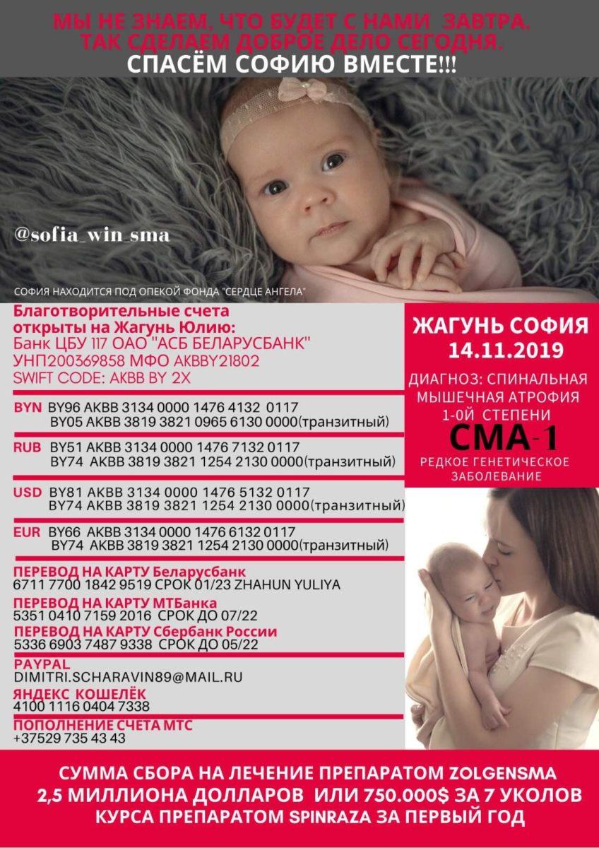 София Жагунь появилась на свет 14 ноября 2019 года. Спустя месяц у девочки начались проблемы со здоровьем, а 16 января врачи поставили ей страшный диагноз – спинальная мышечная атрофия 1 типа. Дети с такой болезнью без лечения не доживают до двух лет. Помочь Софии может самое дорогое лекарство в мире, стоимость которого составляет 2,5 млн долларов. Родители девочки сразу объявили сбор средств на лечение. По данным на 23 февраля уже собрано 277 072 доллара.