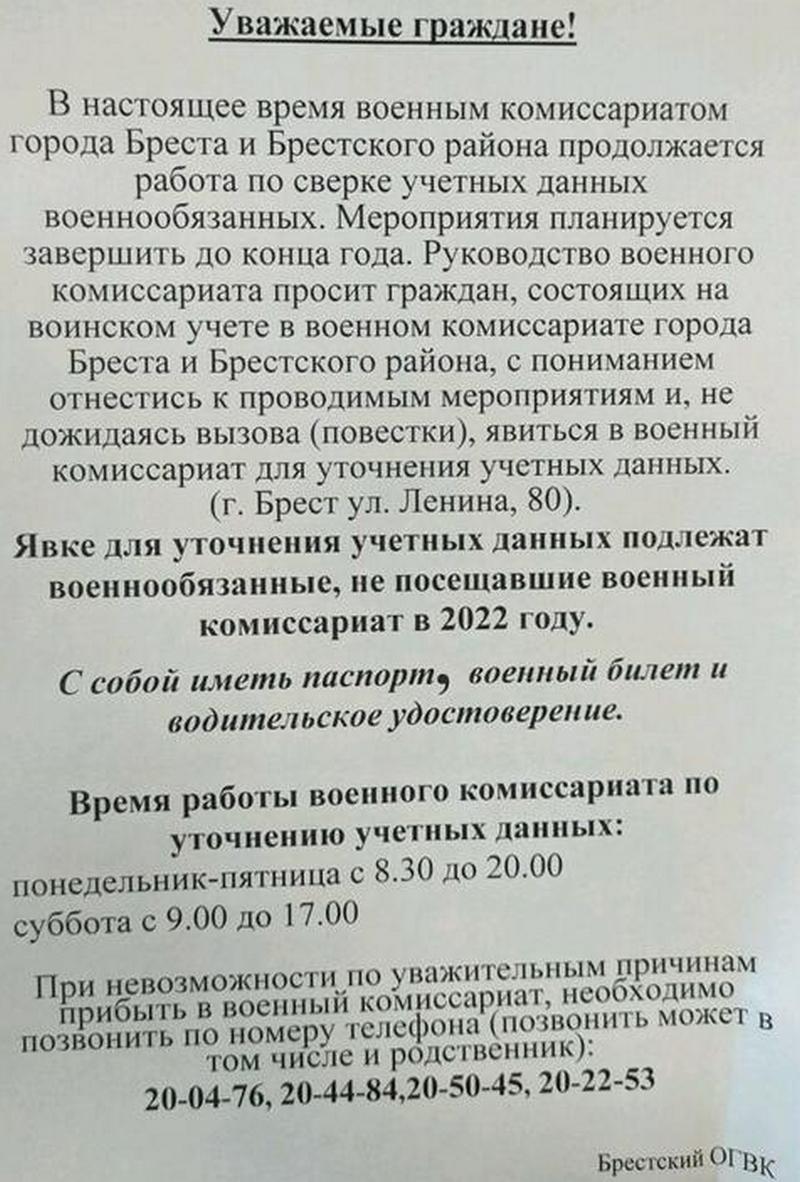 Читайте также: Повестки закончились? В Бресте, Барановичах и Ляховичах военнообязанных просят самих явиться для сверки данных
