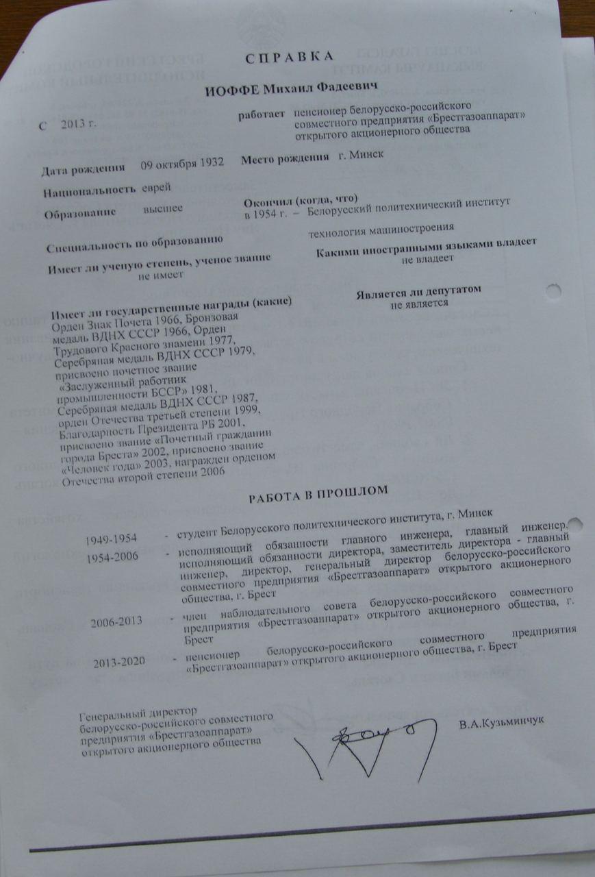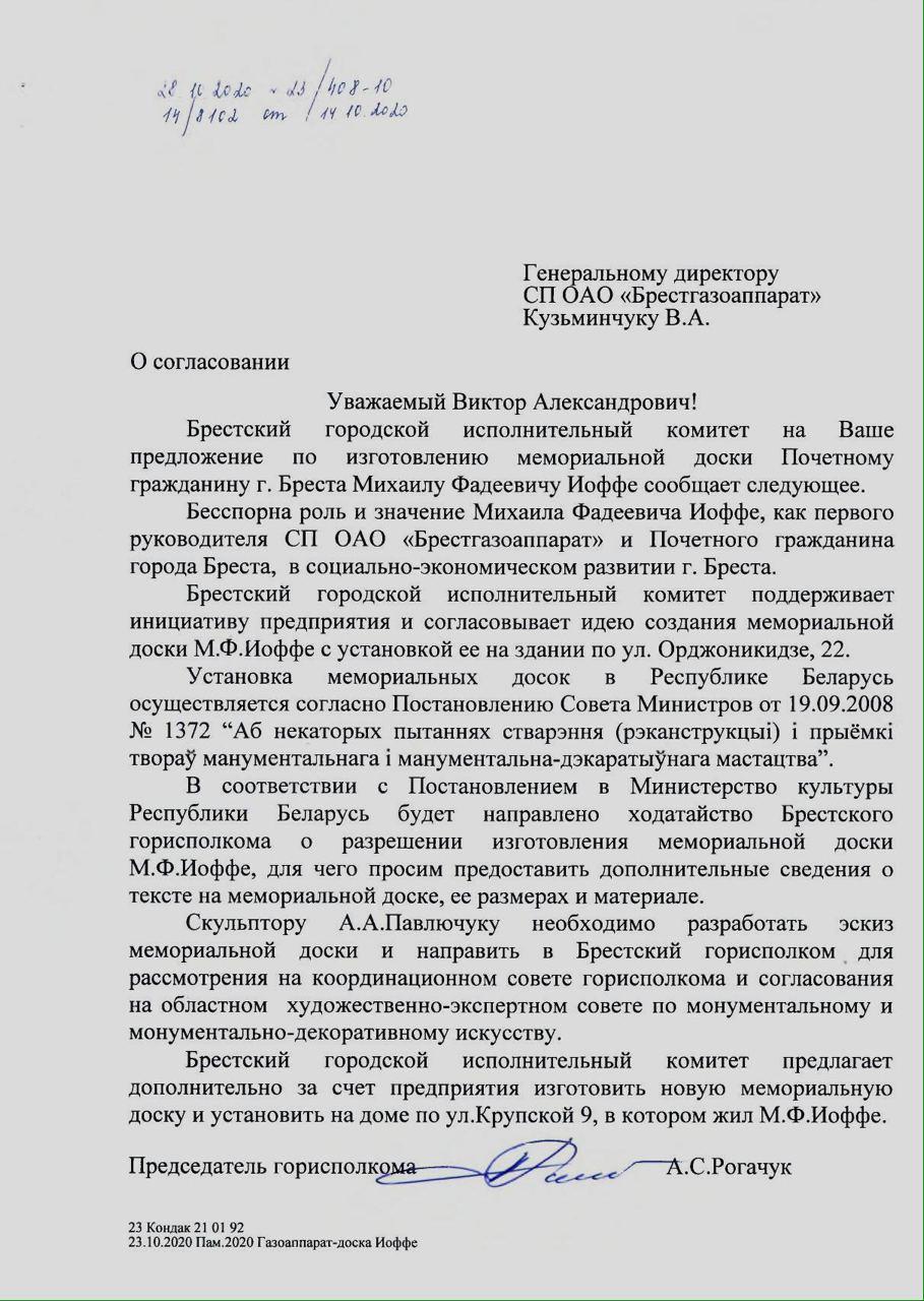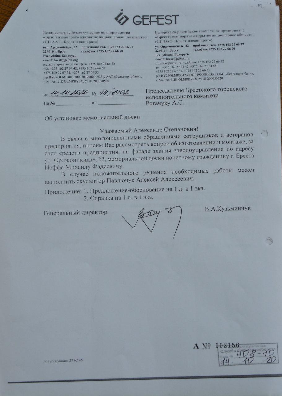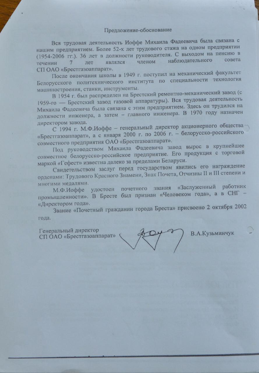 СП ОАО «Брестгазоаппарат» выступило с идеей создания и установки мемориальной доски почетному гражданину Бреста Михаилу Фадеевичу Иоффе, который ушел из жизни 7 октября этого года. Табличку предлагалось установить на фасаде здания заводоуправления по адресу ул. Орджоникидзе, 22. Скульптора тоже нашли: работы готов выполнить Алексей Павлючук.