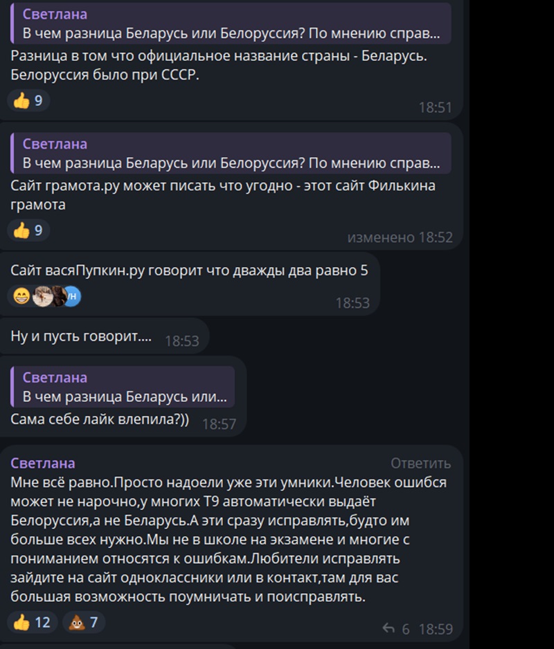 «Мне всё равно.Просто надоели уже эти умники.Человек ошибся может не нарочно,у многих Т9 автоматически выдаёт Белоруссия,а не Беларусь.А эти сразу исправлять,будто им больше всех нужно.Мы не в школе на экзамене и многие с пониманием относятся к ошибкам.Любители исправлять зайдите на сайт одноклассники или в контакт,там для вас большая возможность поумничать и поисправлять».