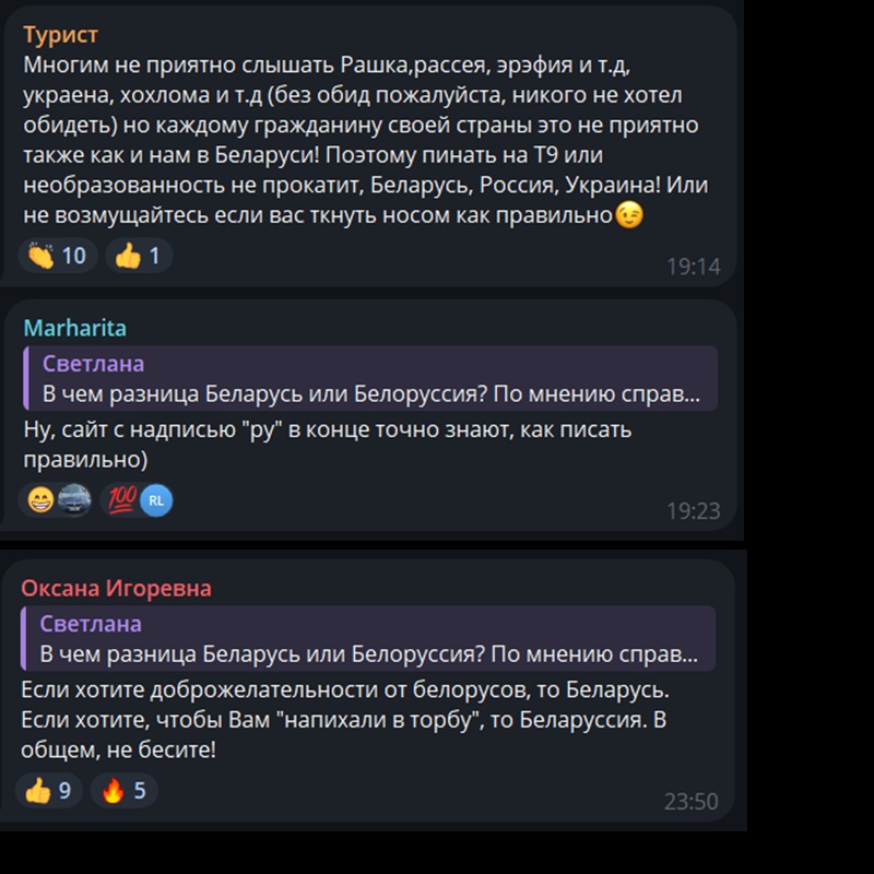«Многим не приятно слышать Рашка,рассея, эрэфия и т.д, украена, хохлома и т.д (без обид пожалуйста, никого не хотел обидеть) но каждому гражданину своей страны это не приятно также как и нам в Беларуси! Поэтому пинать на Т9 или необразованность не прокатит, Беларусь, Россия, Украина! Или не возмущайтесь если вас ткнуть носом как правильно?».