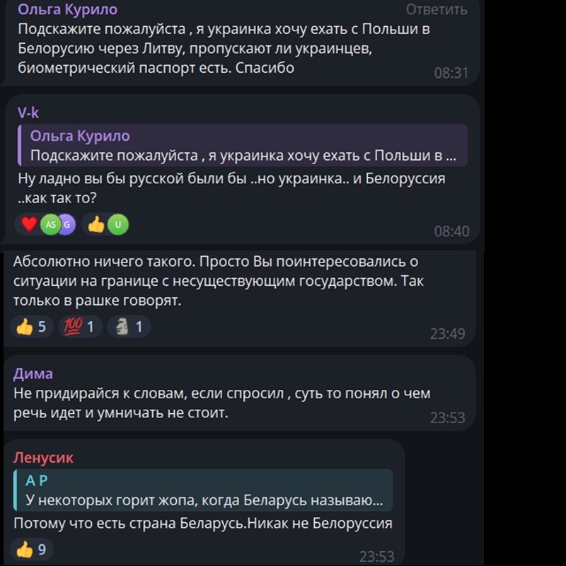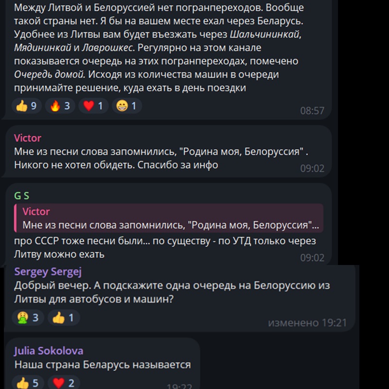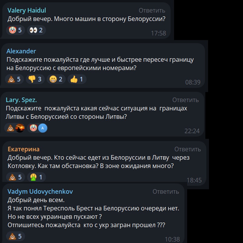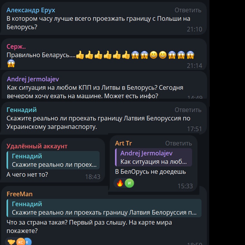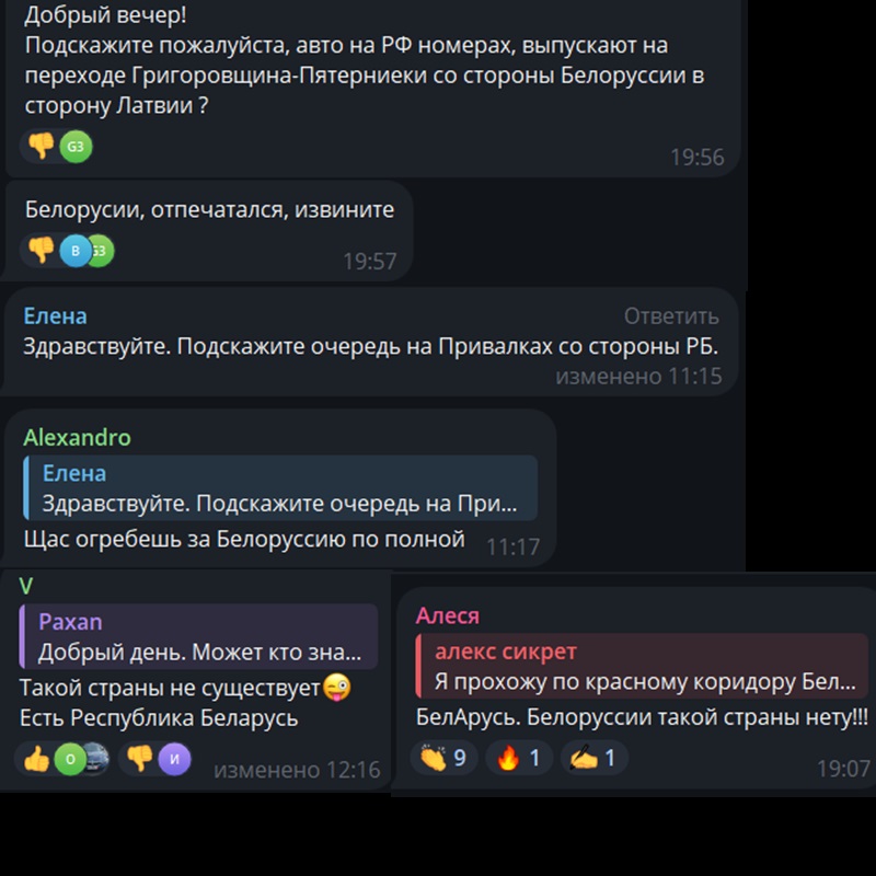 Суммарно в приграничных чатах, которые мы читаем, состоит более 120 тысяч человек. Больше всего там беларусов. Есть много россиян и украинцев. Встречаются также поляки и литовцы. Россиян обычно в чатах идентифицировать легко: они неправильно пишут название Беларуси и пункта пропуска «Тересполь». А самые смелые из них еще и объясняют беларусам, как правильно писать название нашей страны.