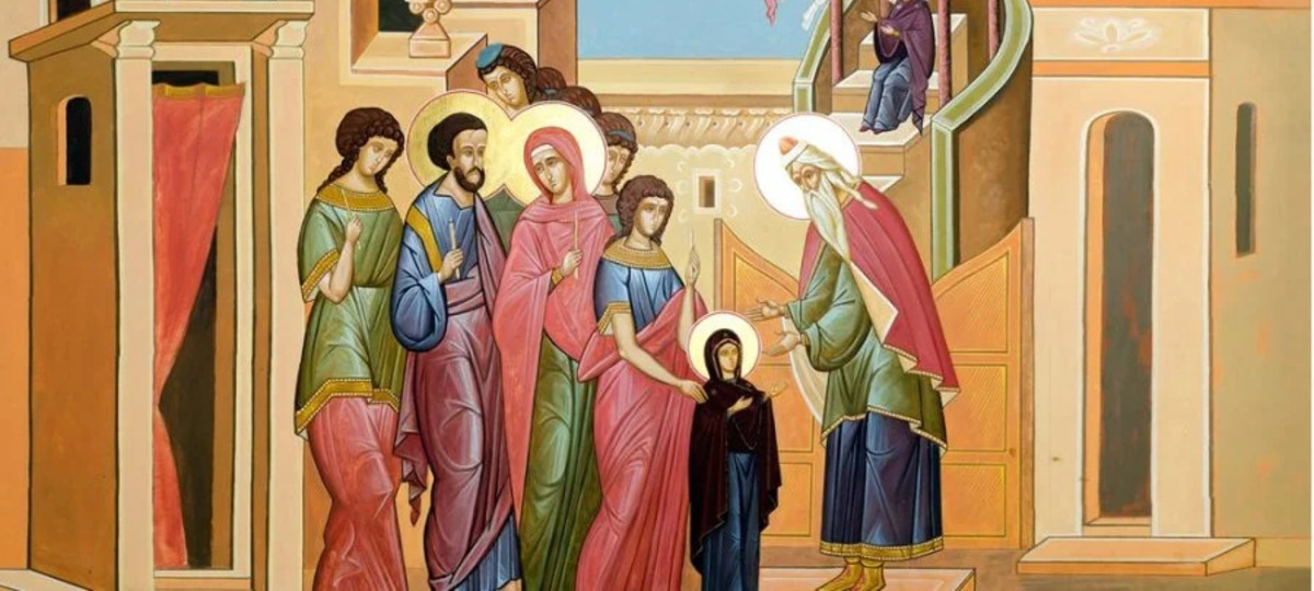 Согласно Священному Преданию, когда Деве Марии исполнилось 3 года, родители отвели ее в Иерусалимский храм. Ко входу в храм вели 15 высоких ступеней. Полагалось медленно подниматься по ним и на каждой ступени петь один из 15 особых псалмов. Когда Иоаким и Анна поставили Марию на первую ступень, укрепляемая силой Божией, она быстро преодолела остальные ступени и взошла на верхнюю.