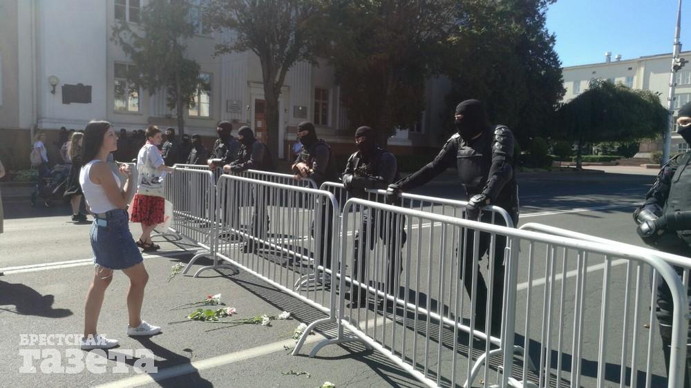 О том, что в центре Бреста в субботу проходили массовые акции протеста против фальсификации президентских выборов, можно догадаться только по турникетам, выставленным поперек улиц, выходящих на главную площадь города. Со стороны площади люди в защитной экипировке. Они стоят в расслабленных позах, опираясь на турникет.