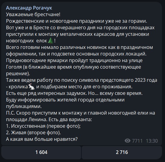 Несколько постов телеграм-канала А. Рогачука были  посвящены главной елке на площади Ленина. 9 ноября в нем шла речь о подготовке города к новогодним и рождественским праздникам. А еще  подписчикам было предложено проголосовать, какую елку установить на площади Ленина: искусственную или живую.